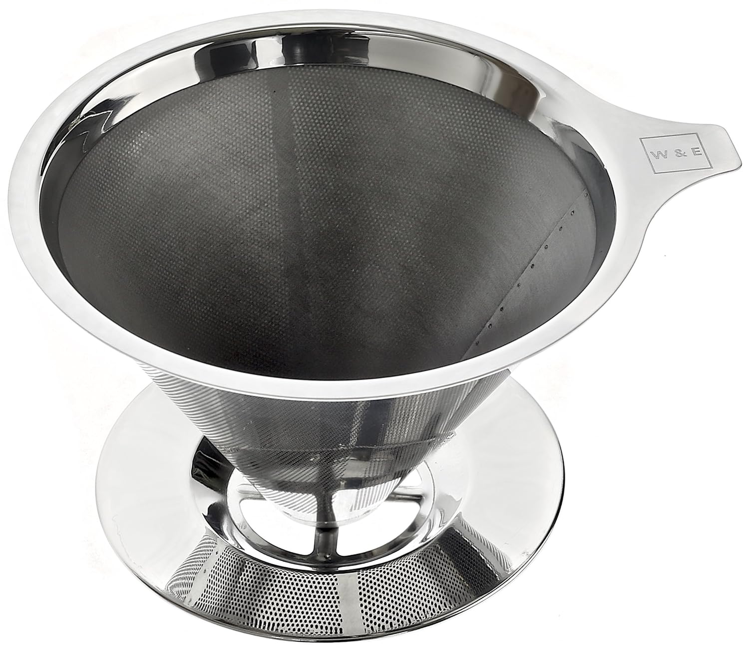 It is made 18/8 food grade stainless steel and the fine mesh keeps out the grounds pretty well. It also makes a great cup of tea. This is one of those gadgets that I never thought I needed but use nearly every day.
